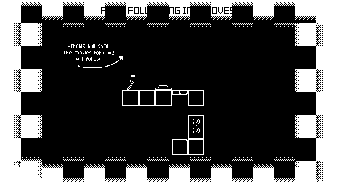Here is a small platform puzzle game where you play as a pair of forks looking to cause chaos and get to an electrical wall socket. Using a limited amount of moves, try to get to the electrical wall socket while avoiding falling off onto the floor by working with buttons and trapdoor platforms.